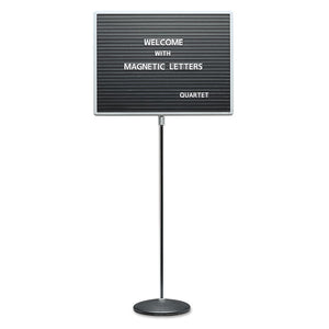 Durable magnetic letter board with adjustable pedestal for maximum display visibility in high-traffic indoor environments. Change displays and easily update messages on magnetic surface. Adjusts from 45" to 62". Weighted single pedestal base for increased stability. Proportionally spaced magnetic white plastic letters (sold separately, items #M3/4 and M1) stand out on solid black surface for maximum readability. Gray-finished radius frame blends with any décor.