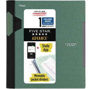 Lasts all year. Guaranteed! Scan, study and organize your notes with the Five Star App. Create instant flashcards and sync your notes to Google Drive to access them anywhere from any device. Rearrange the movable plastic dividers anywhere in your notebook to organize notes. Dividers with expanding pockets hold 8.5" x 11" handouts. Visible tabs from front cover make it easy to flip to any section. Spiral Guard covers the wire to help prevent snags on clothes and backpacks. Label your notebook on the writable spine, and keep your favorite pen or pencil handy in the pen loop. Guarantee is valid for one year from purchase date. Does not cover misuse.