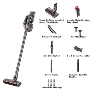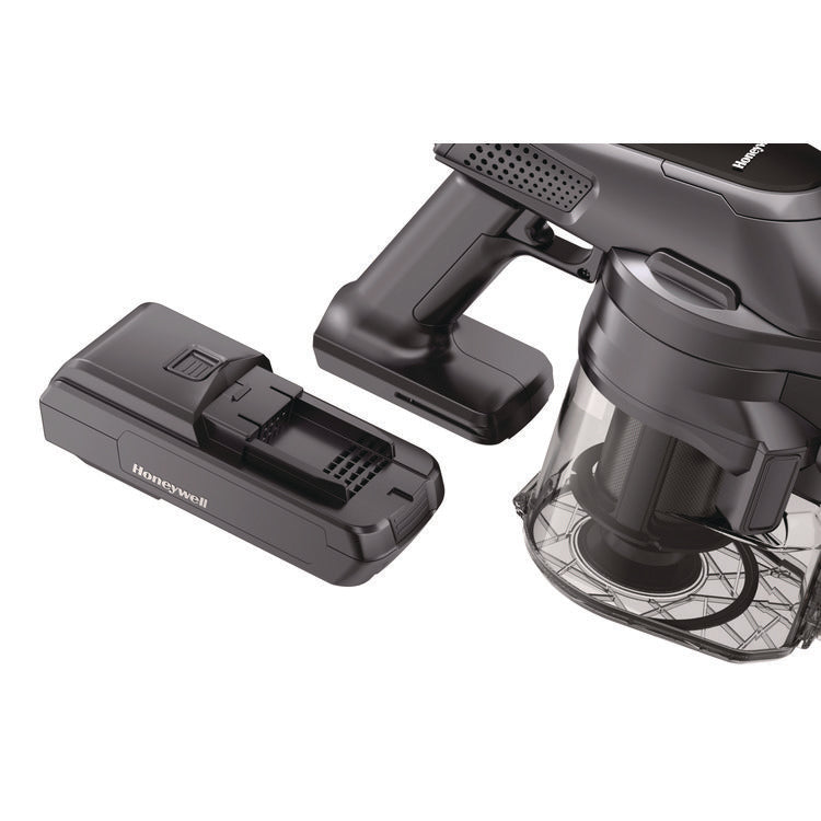Experience powerful suction in a lightweight form with the Honeywell VC16 Aeromax Pro cordless vacuum. This handheld vacuum includes eight tools for optimal cleaning convenience, with its lightweight, cordless design making it easy to carry around and clean every corner. The advanced 600 W digital motor technology delivers powerful suction up to 185 air watts, optimizing energy efficiency. Vacuuming becomes more enjoyable thanks to the innovative tangle-resistant design. For greater clarity, a full-length natural Brite White LED light strip adorns both the carpet and hard floor rollers, with an additional LED spotlight on the handheld body. The vacuum also features advanced cyclonic tank design, which, combined with the HEPA filter, provides up to 99.9% dust and air separation. The innovative ISC technology further boosts self-cleaning, maintaining the efficiency of the HEPA filter. Comfort is prioritized with the ergonomic wellness design, which naturally accommodates the wrist during use. The easy change, high-capacity battery pack provides up to 60 minutes of run time. An advanced LCD display enables easy one-touch control for effortless management of speed and power, with an easy one-press disposal feature for swift dustbin emptying. The vacuum also includes a motorized, patent-pending rotary brush for improved cleaning efficiency, and scented beads for a more pleasant aroma. With its innovative bendable flex hose designed to stay in place, cleaning hard-to-reach places is easier than ever with the Honeywell VC16 Aeromax Pro cordless vacuum.