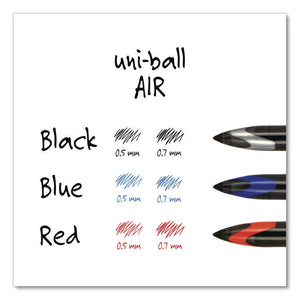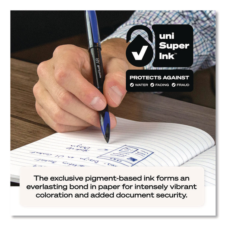Enjoy a smooth writing experience with AIR Porous Point Rollerball Pens from uni-ball featuring a 0.7 mm medium point. These pens have an innovative sleek tip that writes at any angle while producing crisp, skip-free lines. The porous point rollerball pens adapt to your personal writing grip style, adjusting line widths depending on the pressure of your hand as you write. Combining the fluid ink of a marker with the durability of a rollerball, these pens deliver a smooth writing experience while ensuring your documents are easy to read. Suitable for a variety of writing tasks including journaling, scrapbooking or sketching, these pens glide easily over paper, delivering vibrant marks and lines. uni Super Ink technology ensures the ink adheres strongly to the paper, offering protection from fraud, fading and water. A glass-like plastic clip gives these fine marking pens a stylish look while adding a touch of convenience. Experience effortless writing the moment the pen hits the paper with AIR's versatile cushion tip technology and fluid, free flowing ink.