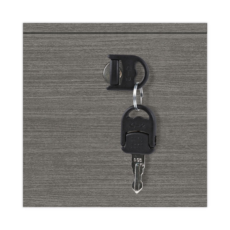 Sturdy, four-sided drawer construction file cabinet with separate front panel. Durable construction that's designed to resist water, scratches, and dents. Finish has a charcoal accent line under worksurface. Can be used as a freestanding file or in combination with credenza shell, which is sold separately. The top removes for installing under worksurface. Two, fold-away safety keys (included) for a slimmer profile.