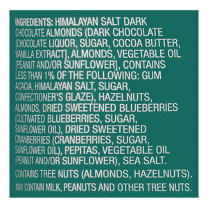 - Made with almonds, salted dark chocolate covered almonds, dried sweetened cranberries and blueberries, cashews, and pepitas.
