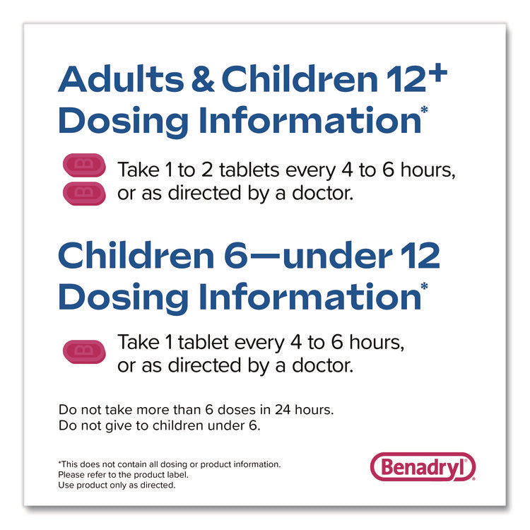 Get convenient, on-the-go cold and allergy relief in a small antihistamine tablet. Each tablet has 25 mg diphenhydramine HCl to temporarily relieve symptoms and provide powerful allergy relief from hay fever, upper respiratory allergy and common cold symptoms in one small, oval shaped coated tablet. These Go Packs come in convenient packets with two tablets per packet, making it easy to bring with you when you are on-the-go or traveling. Easy-to-swallow tablets. relieve symptoms like sneezing; runny nose; itchy throat and nose; and itchy, watery eyes and the common cold symptoms of runny nose and sneezing. A trusted allergy brand, Benadryl Ultratabs are intended for adults and children ages six and up. The allergy tablets from a doctor recommended brand provide safe and effective allergy relief when used as directed.