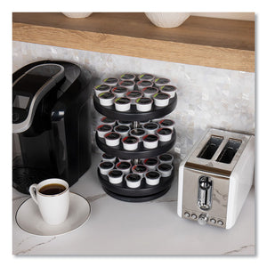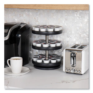 Compact and convenient coffee pod storage. Just right for your breakroom, reception area, or hospitality suite, this single serve coffee pod carousel organizes everyone's favorite flavors and minimizes messes. Just fill up this coffee pod dispenser and reward yourself with a hot cup of javano assembly required. It stores up to 15 single-serve pods in each of its three rotating tiers for total of 45 pods. You can arrange them in multiple ways to suit various tastes and preferences. Spills happen, especially when days get hectic. There is no reason to fret about time-consuming cleanup as this coffee pod organizer cleans up quickly with the help of a damp cloth. It is made from heavy-duty plastic which stands up to everyday use. Neat, simple, and minimal, the coffee pod carousel elevates your breakroom coffee drinking experience and makes busy breaks a breeze.