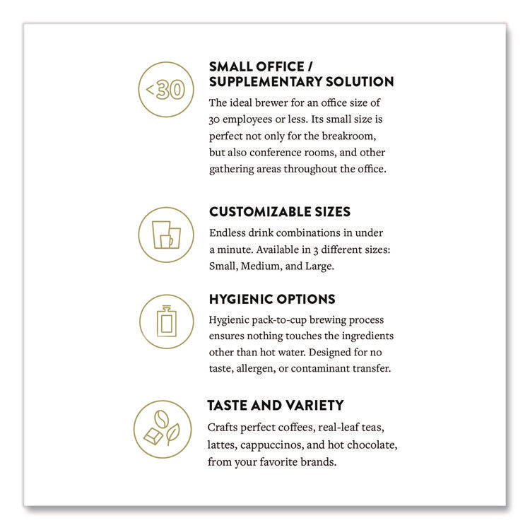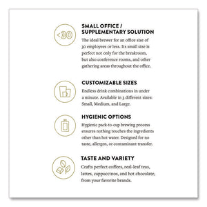 Enjoy your favorite coffees, teas, cappuccinos, lattes, and hot chocolate with the FLAVIA® AROMA. Brewing is simple! Choose from a variety of drinks, and in under a minute, you'll craft your custom beverage with just a push of a button. Perfect for any small office or supplementary spaces such as conference rooms, meeting spaces and more, the Flavia AROMA brewer offers a full range of cafe-style drinks in a small and compact countertop design for any office space. Brew coffees, teas, cappuccinos, lattes, and hot chocolate in three sizes, all ready in less than a minute. With no cleanup or mess and an easy-to-fill water tank, you can enjoy all your favorite custom beverages with just a push of a button. Automatic shut-off.