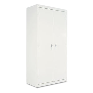 Assembled storage cabinet with three-point locking bar system locks top, bottom, and doors. Durable, reinforced doors with satin chrome double handles open 180° for easy access to contents. Industrial-grade steel with powder coat finish for long lasting use. The sturdy, 16-gauge door frame prevents racking. Heavy duty secure knuckle hinges for longevity. Built-in leveling glides help compensate for uneven floors.