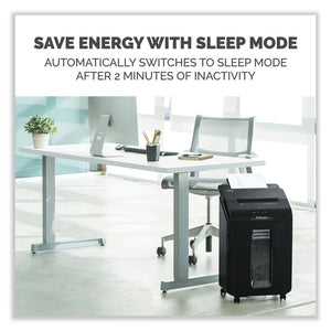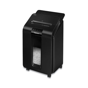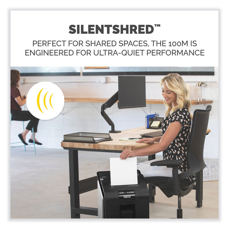 The 100M features a versatile FlexShred ™ capability that shreds up to 100 sheets automatically or 10 sheets manually. Shred credit cards, paper clips and staples using the manual slot. The micro-cut P-4 security level provides superior protection with shreds 6X smaller than standard cross-cut. The 100M shreds for 15 minutes before a cool down period is needed. The SilentShred feature offers ultra-quiet performance for shared workspaces. Auto Reverse stops and reverses paper if a jam occurs. The Sleep Mode shuts down the shredder after 2 minutes of inactivity to save energy. A spacious 6-gallon pull out bin eliminates the need for frequent emptying.