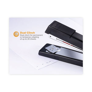 A popular desktop classic that delivers a lifetime of reliable performance. Constructed entirely of metal, this traditional full-strip stapler staples up to 20 sheets and features the ability to choose adjust for standard stapling or temporary stapling with a quick flip of the Dual Clinch plate. Also conveniently opens for bulletin board tacking and crafting. Visual staple window informs you when your staple supply runs low. Uses standard staples.