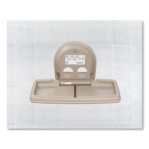 Front panel and flange are one-piece deep drawn stainless steel which eliminates seams, sharp edges and weld lines. Baby changing surface includes Microban antimicrobial protection which inhibits growth of bacteria on the product reassuring patrons of a hygienic surface. Dual-cavity liner dispenser has integral spring tab that dispenses one liner at a time. Integral frame offers exceptional bed stability and minimal deflection. Equipped with tumbler lock, keyed alike. Includes stainless steel external bag hook.