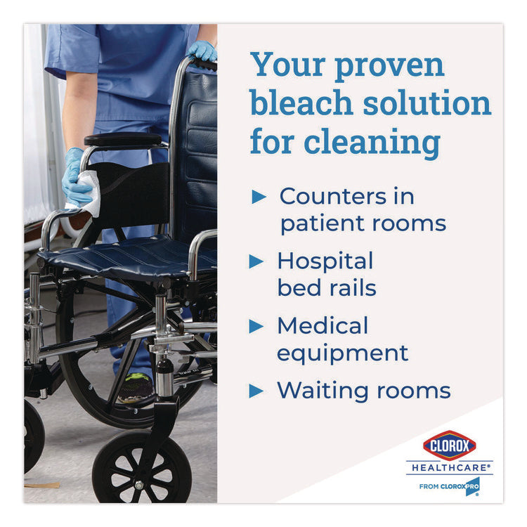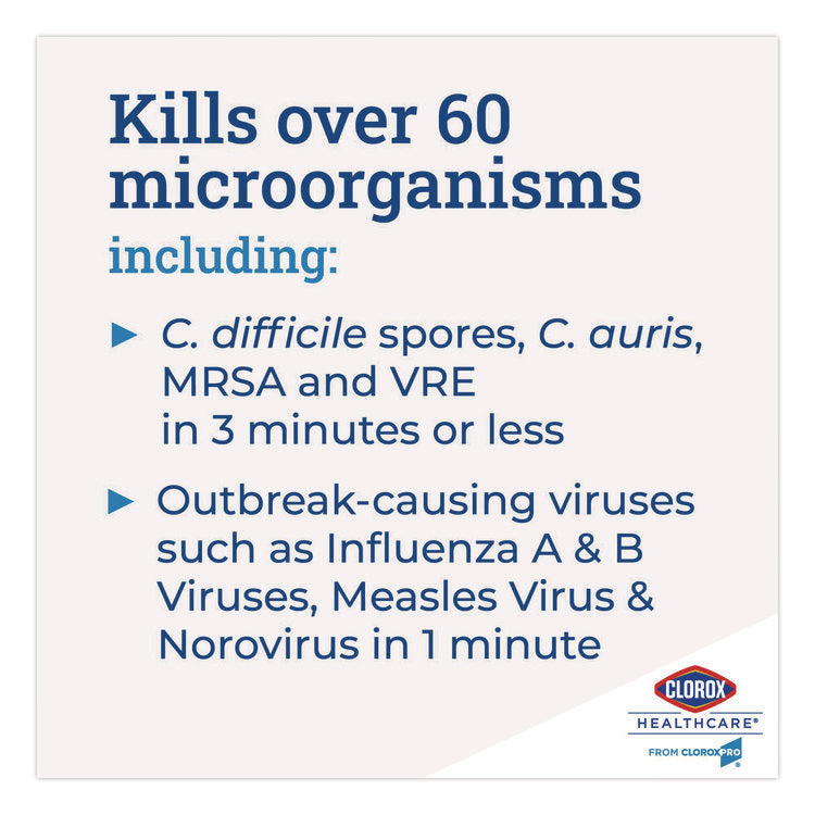 Your proven bleach solution for cleaning. Clorox Healthcare® Bleach Germicidal Wipes kill C. difficile and C. auris in three minutes and 58 other microorganisms in one minute or less, including outbreak causing viruses, emerging viral pathogens, MRSA and VRE when used as directed. With superior surface compatibility on a wide range of hospital surfaces, these disinfecting wipes help you cover more square footage per wipe with fast contact times and greater wetness surface coverage than the leading competitor. The phosphate free formula is optimized to be easy on surfaces and leaves less residue behind. Use in healthcare settings including hospitals, medical facilities, outpatient facilities and long term care facilities. Follow special instructions for cleaning prior to disinfection.