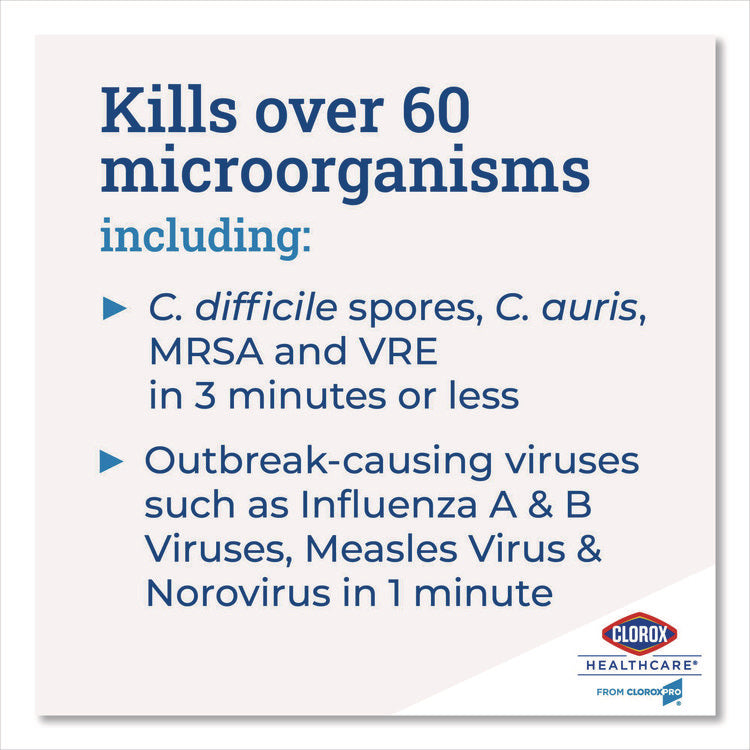 Your proven bleach solution for cleaning. Clorox Healthcare® Bleach Germicidal Wipes kill C. difficile and C. auris in three minutes and 58 other microorganisms in one minute or less, including outbreak causing viruses, emerging viral pathogens, MRSA and VRE when used as directed. With superior surface compatibility on a wide range of hospital surfaces, these disinfecting wipes help you cover more square footage per wipe with fast contact times and greater wetness surface coverage than the leading competitor. The phosphate free formula is optimized to be easy on surfaces and leaves less residue behind. Use in healthcare settings including hospitals, medical facilities, outpatient facilities and long term care facilities. Follow special instructions for cleaning prior to disinfection.