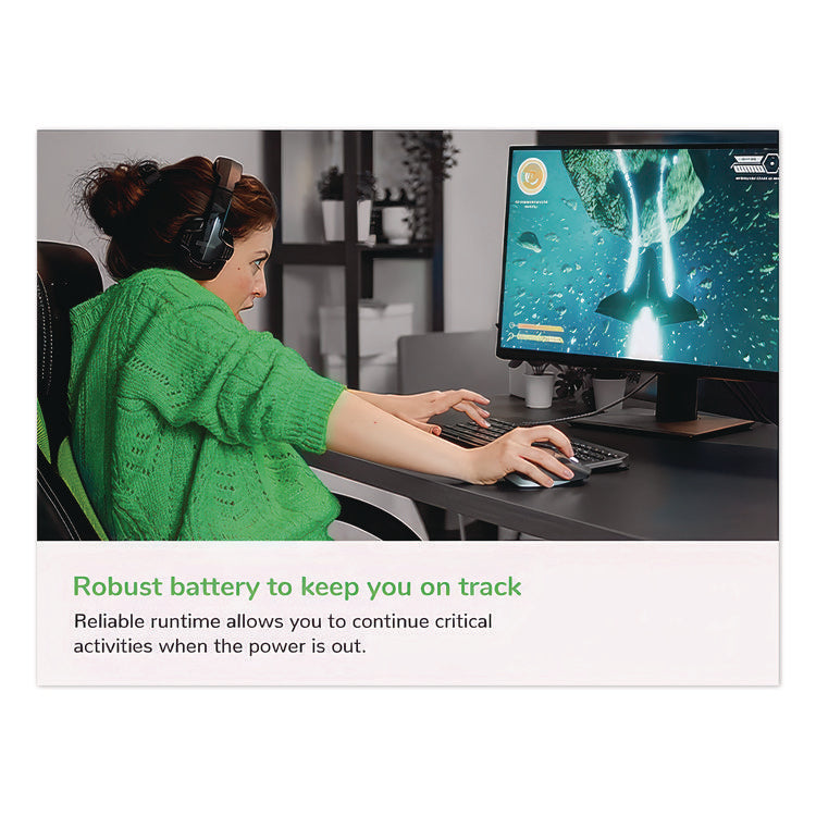 Safeguard your computer, monitor and printer with this protective outlet box. Each of the outlets prevents voltage spikes, and four of these outlets supply battery-operated backup power as soon as electrical service is interrupted. Three wide-spaced outlets permit the use of transformer-based plugs. Audible alarms notify you of changing utility power and UPS conditions. The LED status display indicates On Line, On Battery and Building Wiring Fault conditions.