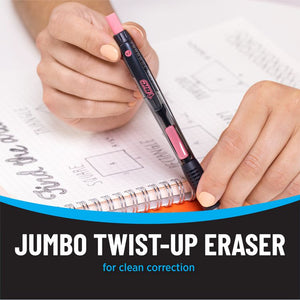 - Easily erase unwanted marks and make clean corrections with the jumbo twist-up erasers that won't smudge.