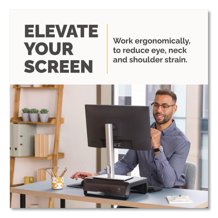Featuring a modern design aesthetic and an innovative feature set, the Breyta™ Monitor Stand is an excellent choice for anyone who wishes to alleviate eye, neck and shoulder strain by elevating their monitor to a more comfortable level. With three height settings and a unique stacking column design, it's easy to achieve an ergonomic viewing angle; and since the stacking columns can be clipped flat against the underside of the platform, it's compact and portable, too, making it ideal for hybrid work scenarios. The support columns also feature an open-loop design and non-skid rubber feet to both accommodate cord management and deliver extra stability. Sturdy, high-impact plastic construction.