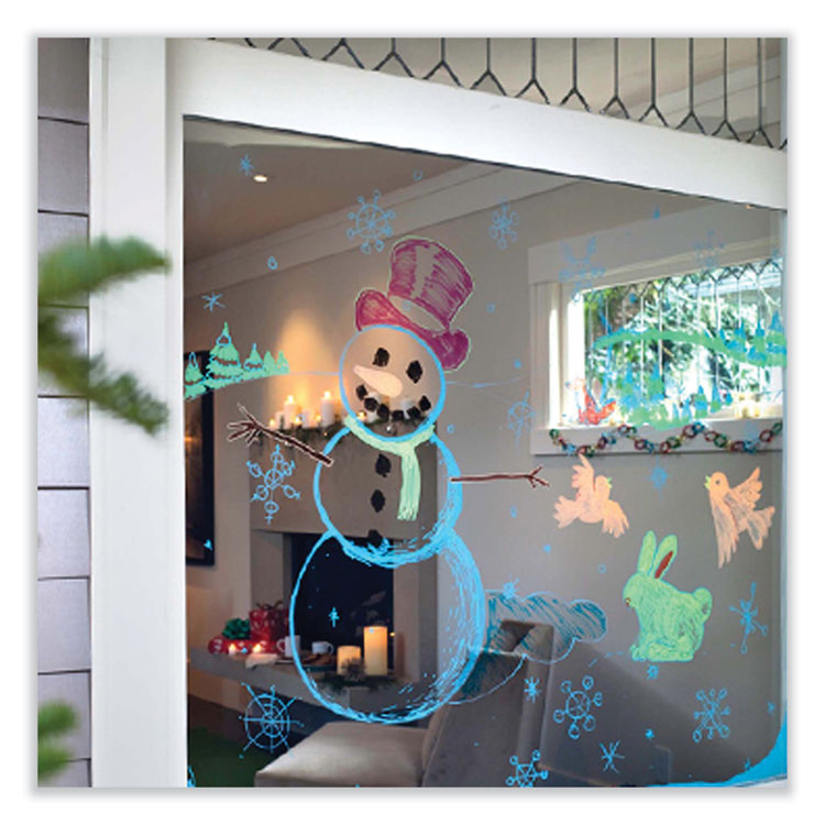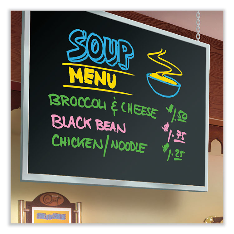 Create attention-grabbing signage and designs for restaurants, stores, parties and festivals on black erase boards, white boards and glass. Bright neon colors are ideally suited for areas illuminated by ultraviolet lighting. When using a wet cloth, the certified water-based ink formula easily wipes off of any dry-erase surface.
