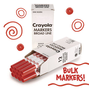 Order your favorite Crayola marker color in bulk! Conveniently packaged in a reusable tuck box, each set contains 12 of the same color. With its conical tip, the Crayola broad-line marker is a versatile drawing tool. Perfect for coloring in large areas, this marker is also great for drawing thin lines or dots. Kids can even create a ribbon effect with lines that taper from thick to thin. The broad-line marker lays down plenty of color and won't smudge or bleed through paper. Great for classrooms, art studios, and more!
