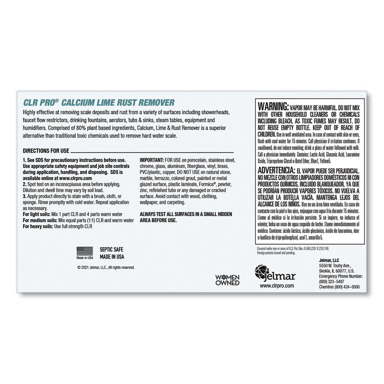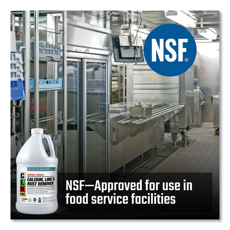 Powerful, trusted multi-use cleaner dissolves even the hardest calcium and lime buildup, rust, mineral deposits, hard water stains, soap scum, and oxidation. Certified EPA's Safer Choice for safer chemistry means that this formula is safe for use in a wide variety of applications including dishwashers, coffeepots, sinks, toilets, glass, siding, stucco, sprinkler systems and more! CLR PRO Calcium, Lime and Rust Remover is NSF Registered and is approved for use in food processing, food storage, and food service facilities. Plumbing and septic safe. Phosphate-, bleach-, ammonia- and alcohol-free.