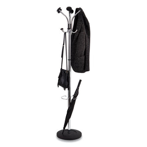 Steel tubing with weighted black base. Stylish and functional. Provides six coat knobs, six accessory hooks on a rotating head. Includes an integrated umbrella stand with water retainer. Rotating head for easy access to clothes. Weighted base for perfect stability. Easy assembly without tools.