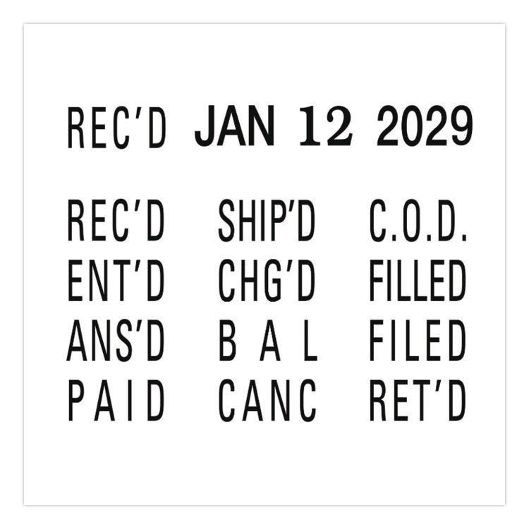 Add dates and important messages to office memos, invoices and receipts. Simply turn the dials to select the proper message or date for your documents. Months, days and five-year band. Includes phrases on year band: REC'D, ENT'D, ANS'D, PAID, SHIP'D, CHG'D, RET'D, BAL, CANC, C.O.D., FILED, and FILLED. Stamp lasts for thousands of impressions. Can be re-inked with 2000 Plus® self-inking refill ink.