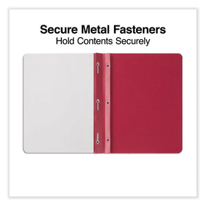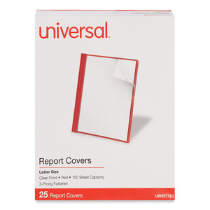 Traditional clear front report cover offers a full view of your title page. Three prong fasteners hold letter size punched sheets. Leatherette embossed paper back cover.