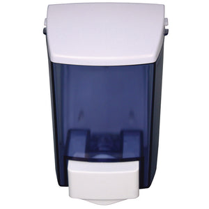 Unique water-resistant top, ideal for showers. Smooth, curved design prevents bacterial growth. See-through 30-oz tank. For liquid and lotion soaps, except pumice.