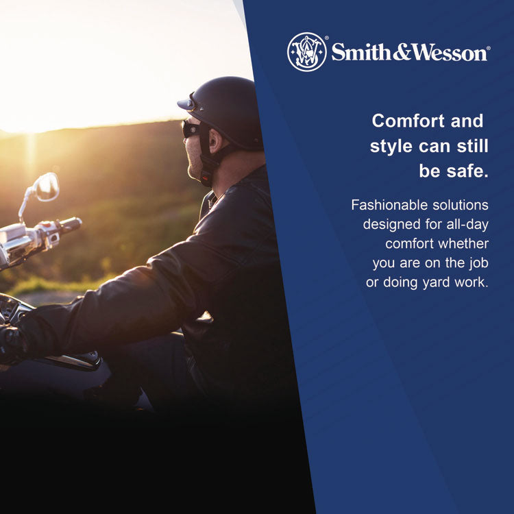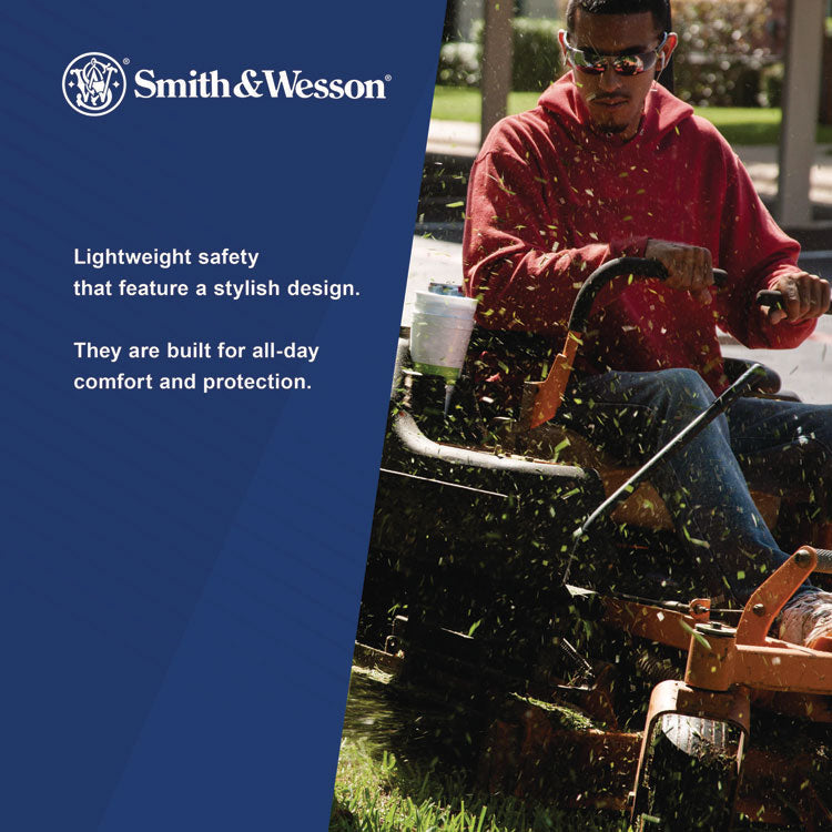 Smith & Wesson® Code 4 Safety Glasses are a smart way to provide all-day comfort and protection, for both work and play. The stylish, minimal black frames hold smoke-colored lenses (ideal for outdoor or bright environments) with a 7-base curve. The ribbed nose cushion helps keep the glasses from slipping and the contoured temple tips give the wearer a precise fit. The hinge stop helps prevent lens damage, so the protective glasses are really built to last. These glasses provide 99.9% UVA/UVB/UVC protection. No matter where you’re using them, at work or at home, Smith & Wesson® Code 4 Safety Glasses deliver the comfort and protection you need.