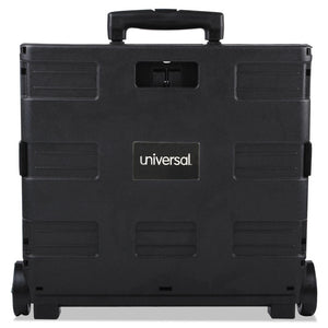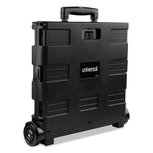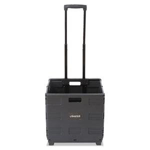 Ideal for transporting bulky items with ease in just one trip. High capacity (1.7 cu. ft.) rolling crate with built-in telescoping handle. Collapses flat to 3-1/2" for easy storage; opens in seconds. Includes support rails for additional durability and carrying grips on all sides for lifting. Lightweight, extremely durable plastic frame. Two non-marring wheels. Supports up to 60 lbs.