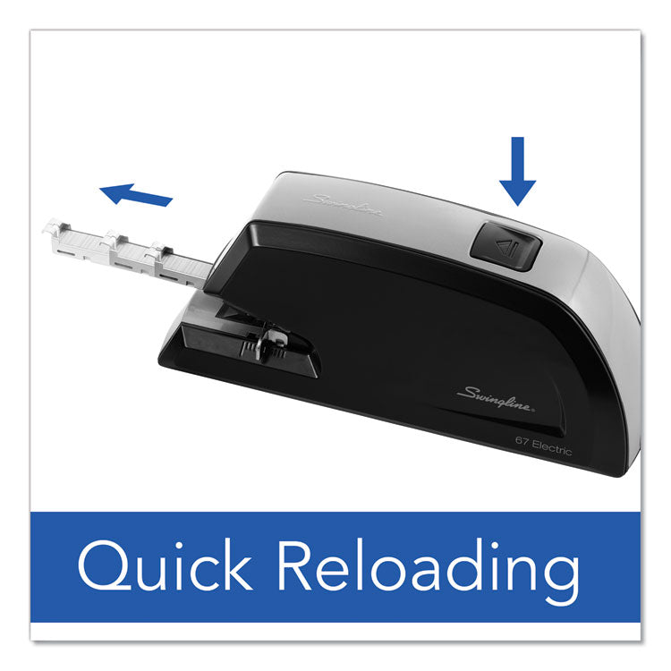 This sturdy electric stapler stands up to frequent use. You can depend on the high quality and durability of this stapler for reliable stapling performance each and every day. Designed for everyday use, this durable metal Swingline Commercial Electric Stapler provides long-lasting performance. Staples up to 20 sheets at a time. For best results, use Swingline S.F. 4 staples. Great for busy offices, this electric stapler is will get stapling jobs completed more quickly and efficiently. Easy front-loading QuickLoadsystem ejects the staple magazine with the push of a button for faster staple refills. Includes an adjustable paper depth guide so it's easy to choose how far the staple is positioned from the edge of the paper. Flat clinch tightly flattens the staple reducing papers from curling up at the edges to form neater paper stacks. An indicator light illuminates red to conveniently let you know when there are no staples in the magazine or if they are low. The light flashes red when the magazine is still ejected. Rubber feet on the bottom of the stapler provide durable traction. 100% Performance Guarantee.