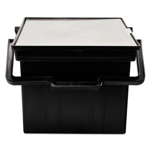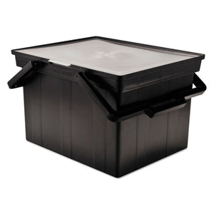 - Industrial grade plastic portable file holder with see-through, hinged lid.