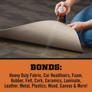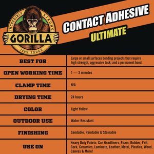Gorilla Contact Adhesive Ultimate is an incredibly strong, permanent contact adhesive that resists heat and moisture. Our formula has an aggressive tack that can be used on a variety of materials and surfaces, both indoors and out. The adjustable anti-clog nozzle is easy to use and offers three ways to spray web pattern, for a narrower or wider application.