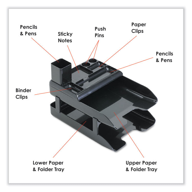 Sleek, ergonomic tray design features nonslip, anti-scratch pads that won't damage desktop surfaces. Two letter-size trays organize and store important papers and files, while the convenient supply organizer and pencil cup sit atop the tray for easy access, or can be used alone. Sturdy tray risers allow the trays to stack for vertical organization. Finished in black metallic plastic to enhance this high-profile, modern desk set.