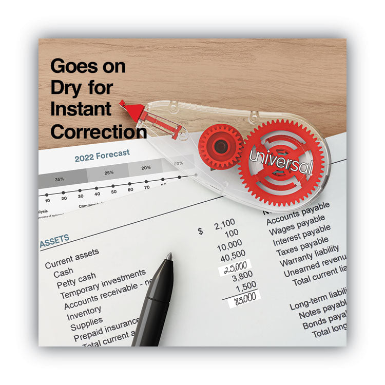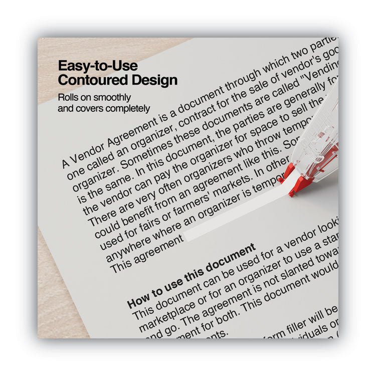 Correcting mistakes couldn't be easier. Convenient, easy-to-use design handles both single- and multiple-line corrections. Film-based white correction tape completely covers print or pen marks in one pass, ensuring uniform results. Transparent casing allows you to keep an eye on your remaining supply levels. Non-refillable.