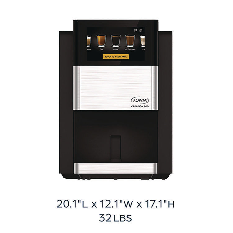 FLAVIA® Creation 600 Coffee Brewer Machine satisfies your entire office with hot and cold beverages, including coffees, teas, lattes, infused waters and more when paired with the Flavia Chill Module. It comes with patented, in-cup frothing with milk and nondairy alternatives. With the C600, you can craft a variety of drink options that meet the needs of every moment while smart technology makes managing office beverages a breeze. Whether it's soothing hot or frothy drinks for heads-down work or refreshing cold drinks that put a little pep in meeting prep, there's something to put a smile on the face of every coffee connoisseur, latte lover, and iced tea queen to help fuel a wonderful day.