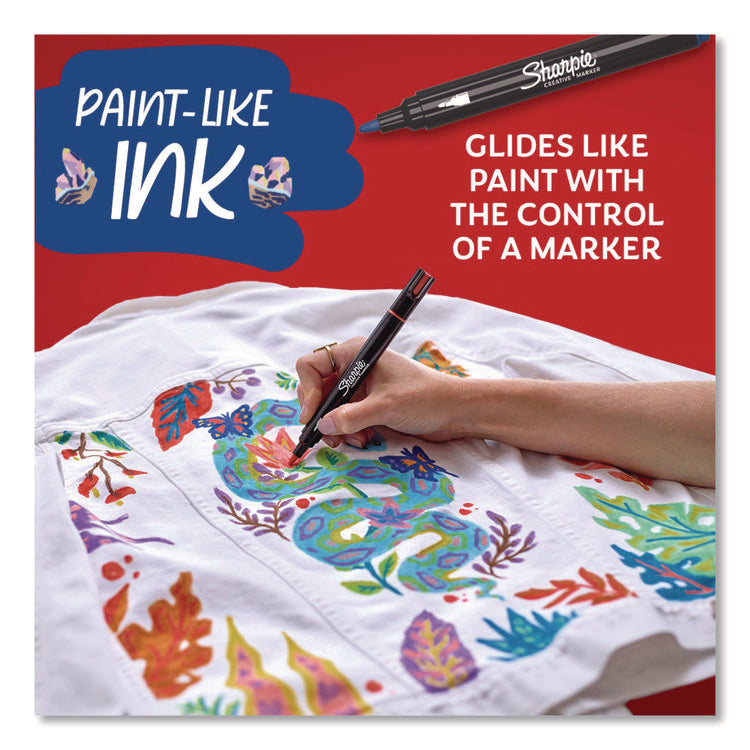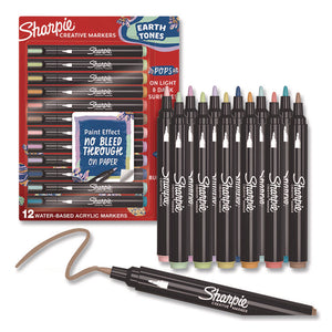 Bring your artistic vision to life with Sharpie Creative Markers! These acrylic markers feature stunning paint-like ink that glides across the page with the control of a marker. The water-based ink won't bleed through paper, so your work stays clean. The bright color markers create vibrant marks on light and dark surfaces and boldly mark on paper, metal, wood, ceramic, glass, rock and canvas. The colors beautifully layer to add dimension to your work. What's more, there's no need to prime these brush tip markers-simply uncap and go!