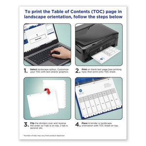 Sometimes finding information at a moment's notice seems like finding a needle in a haystack. These Ready Index® Table of Contents Dividers help you stay organized so you can locate important documents quickly and easily. They feature preprinted alphabetical or numerical tabs that are reinforced for durability and can be used in either landscape or portrait format. Using free templates from Avery Design & Print, you can customize the included title page and print in minutes. Organization and efficiency,— now that's sharp thinking.