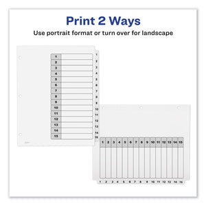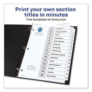 Sometimes finding information at a moment's notice seems like finding a needle in a haystack. These Ready Index® Table of Contents Dividers help you stay organized so you can locate important documents quickly and easily. They feature preprinted alphabetical or numerical tabs that are reinforced for durability and can be used in either landscape or portrait format. Using free templates from Avery Design & Print, you can customize the included title page and print in minutes. Organization and efficiency,— now that's sharp thinking.