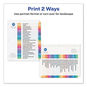 Organized documentation makes a business run like a well-oiled machine. These Ready Index Table of Contents Dividers help you stay organized so you can locate documents quickly and efficiently. They feature preprinted multicolor tabs that can be displayed in either landscape or portrait format. Using free templates from Avery Design & Print you can customize the included table of contents page and print in minutes. Organization and efficiency-makes life better for your business. For laser and inkjet printers.