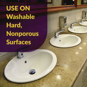 - Disinfectant for use on sinks, urinals, toilet bowls, showers, tubs, bathroom fixtures, doorknobs, counters, floors, and desks.
