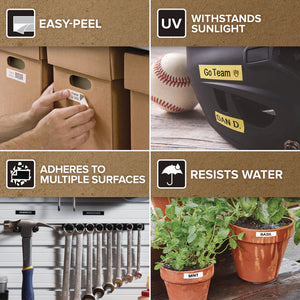 - Label tape is water resistant and withstands exposure to sunlight without fading or peeling.