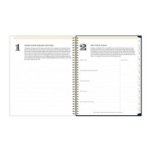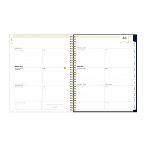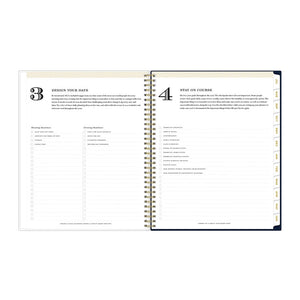 - Weekly calendar view per two-page spread contains space for daily schedule, to-do list, notes section, and an inspirational quote.