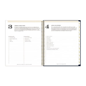 - Weekly view per two-page spread contains space for daily schedule, to-do list, notes and gratitude sections, and an inspirational quote.