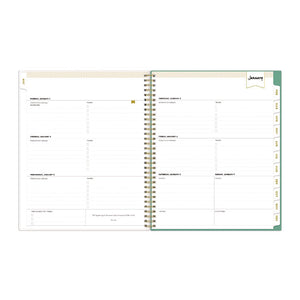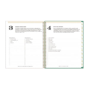- Weekly view per two-page spread contains space for daily schedule, to-do list, notes and gratitude sections, and an inspirational quote.