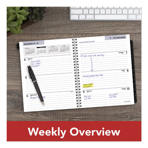 Weekly: one week per two-page spread; ruled block-style for open scheduling; past, current and two future months reference. Monthly: tabbed, full months with unruled blocks on left page, notes space on right. Separate telephone/address and special 16-page information sections. Printed on high-quality with superior ink bleed resistance.