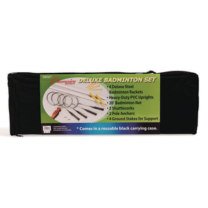 The Champion Sports Badminton Set has everything you need to play a game of badminton. This set includes four deluxe steel badminton rackets, heavy-duty plastic uprights, a 20’ nylon net, two shuttlecocks, two pole anchors, and four ground stakes for support. Everything fits nicely into a handy black carry case for easy storage and transport. You can take it to the park, on a camping trip, or to a backyard BBQ!