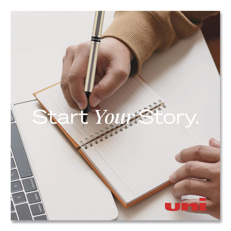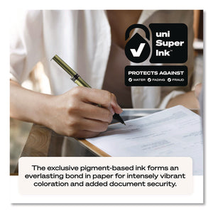 Introduce sophisticated style to your everyday writing with Deluxe Rollerball Stick Pens from uni-ball featuring a strong, long lasting tip. Even-flowing, acid-free liquid ink delivers a smooth writing experience for intense, vibrant lines. Deluxe delivers crisp lines with unparalleled definition, making it easy to create super fine details in your drawings and diagrams. Capped roller pens are useful for a variety of tasks from note taking and list making to signing checks and legal documents. Innovative uni Super Ink technology forms a strong bond with the paper, protecting from water, fading and fraud. Up your writing instrument sophistication with the matte black, brushed steel barrel of the Deluxe capped rollerball pens.