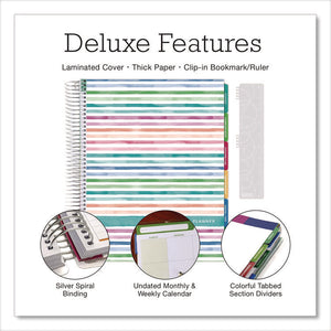 Colorful, sophisticated and compact, the Deluxe Teacher's Academic Planner makes it easy to formulate, schedule and track your lessons. Flexible weekly planning section features five days across and seven periods down, and the tabbed monthly section delivers standard, one-month per two-page spreads. In the back of the book, class-scheduling charts, student lists, seating charts, an abbreviated grading/attendance log, a communications log, a yearly overview and ruled notes pages deliver the tools that busy teachers need. Undated format spans a full 52 weeks. Handy planning stickers, a bookmark and an interior pocket folder are also included.