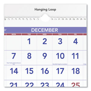 Three-month per page view: past, current and future months. Large, easy-to-read numbers. Federal holidays highlighted. White wirebound with hanging loop.