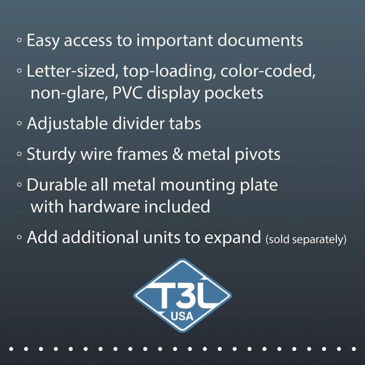Whether at your desk, in a workshop or at a workstation, maximize your productivity by placing important information at your fingertips. Includes desk base unit, two universal mounting brackets, required hardware and 20 assorted wire reinforced pockets. Snap on index tabs with color coded inserts help you find information quickly. Great for production workshops, factories, warehouses, machines, manufacturing lines, and assembly stations.