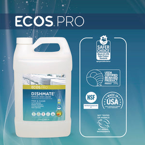 This highly effective ECOS PRO Dishmate manual dishwashing liquid cleans and cuts grease without drying out skin. The unique formulation leaves less residue on dishes for a quicker rinse time and reduction in water usage. The hypoallergenic, pH-balanced formula is made using sustainable, plant-derived surfactants. The product is free of dyes and is gray water and septic safe. Not tested on animals. Manufactured in a facility that is LEED Zero Carbon, LEED Zero Waste and LEED Zero Energy Certified.
