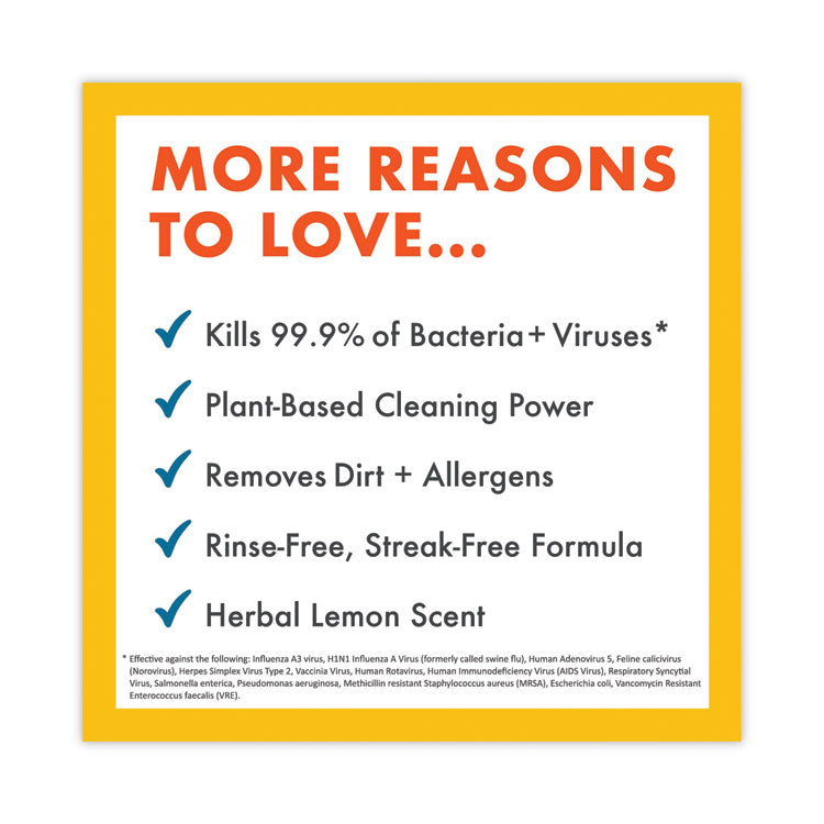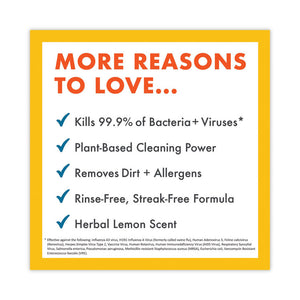Multitasking at its best! This disinfectant cleans, deodorizes and disinfects in one easy step. No need to rinse, even on food contact surfaces and children's toys. Ready-to-use formula requires no mixing. The active ingredient Thymol kills cold and flu viruses on hard, non-porous surfaces and eliminates 99.9% of household germs and allergens. It dries streak-free and leaves no residue. Free from harsh chemicals, this plant-powered lemon scented formula is safe to use around kids and pets.